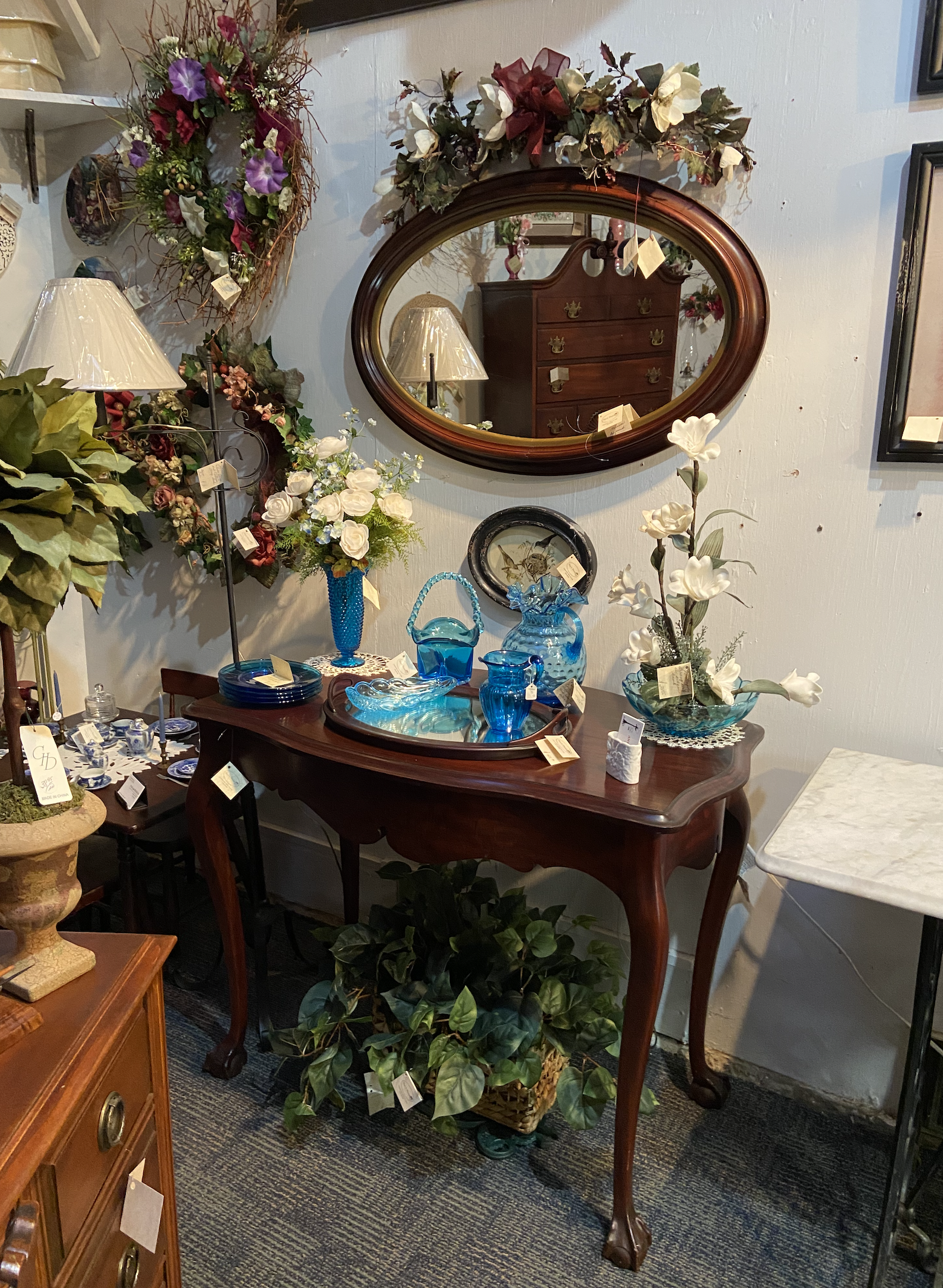 - We also have lamps and shades, hand-painted and period glass, silk florals, and an assortment of rare finds.